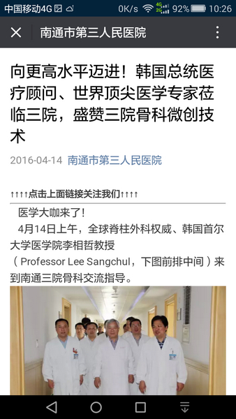 据悉,随着近年来三院骨科微创技术的蓬勃发展,多位国际知名专家来到三院骨科交流、指导。此次是李相哲教授第二次来到南通三院,去年11月6日,李教授首次来院,同医院约定双方将展开进一步合作,共同推动三院骨科发展。