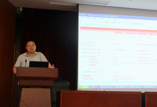 近日,图书馆和科教科联合组织专题讲座,邀请到南京大学信息管理系博士、南通大学图书馆文献检索部主任黄丹俞和南通大学图书馆文献建设部主任、研究馆员申飞驹在五号楼五楼多功能厅会议中心为我院医务人员分别做了题为《科技文献资源深度利用》及《南通大学图书馆数字资源导航、手机图书馆演示》的专题讲座。